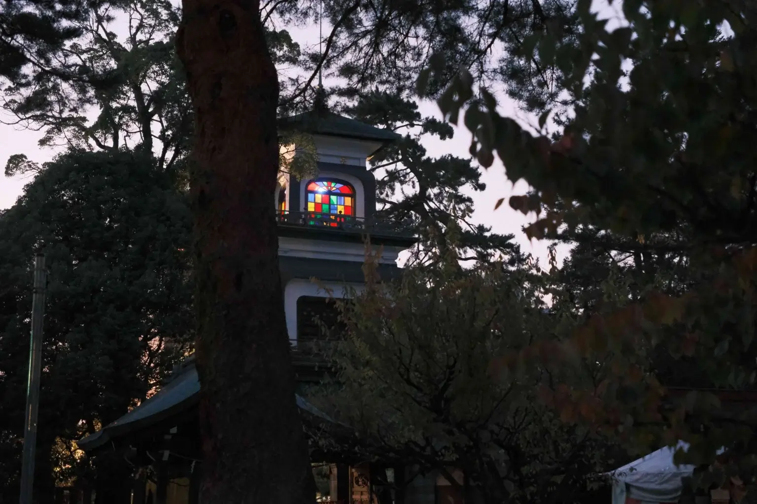 ステンドグラスが施された建物が特徴的で、夜にはライトアップされているのが綺麗で特徴的です。