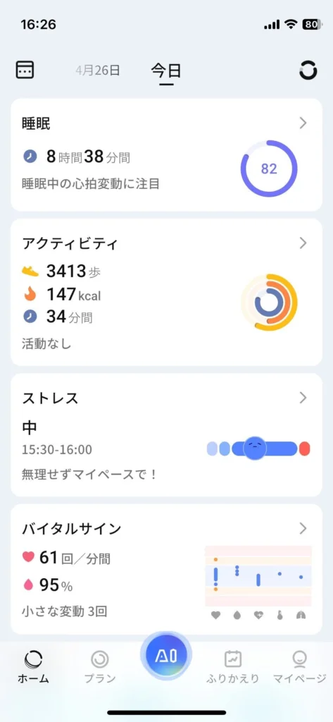 さらには、睡眠や運動、ストレスレベルなどを数値で確認できるので、今日は早く寝よう、今日は少し運動しようといったように自然と健康を意識できます。