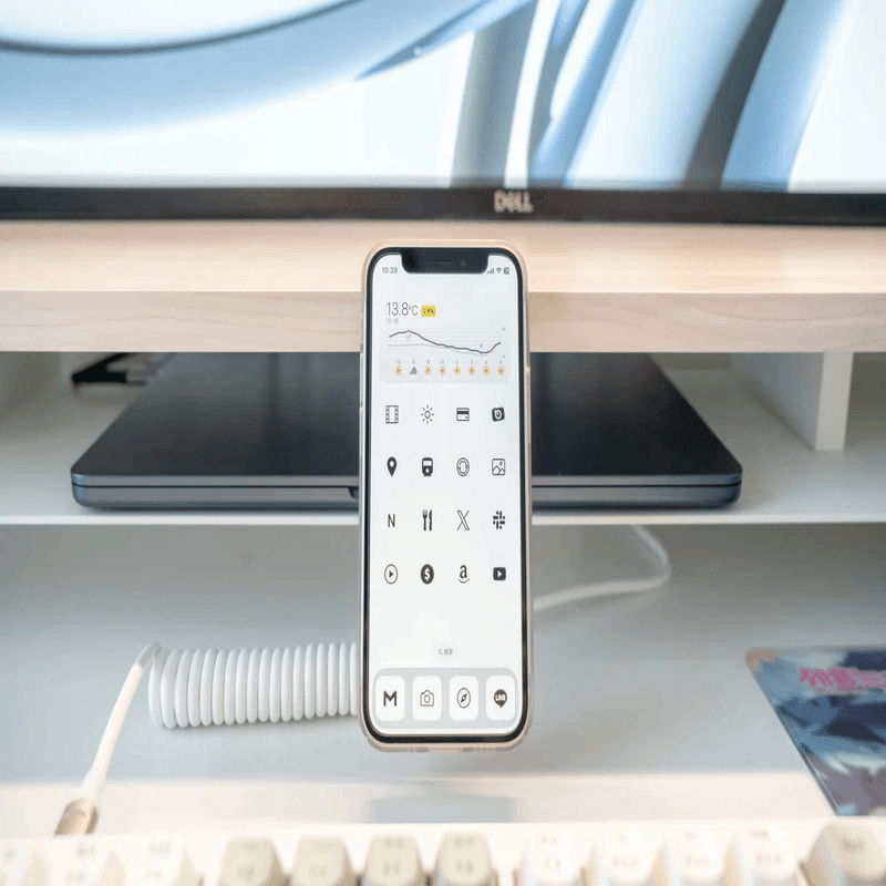 僕はデスクスタンドをデスク上に置いているので、そこに固定することでPC作業しながらスマホが目に入るようにしています。