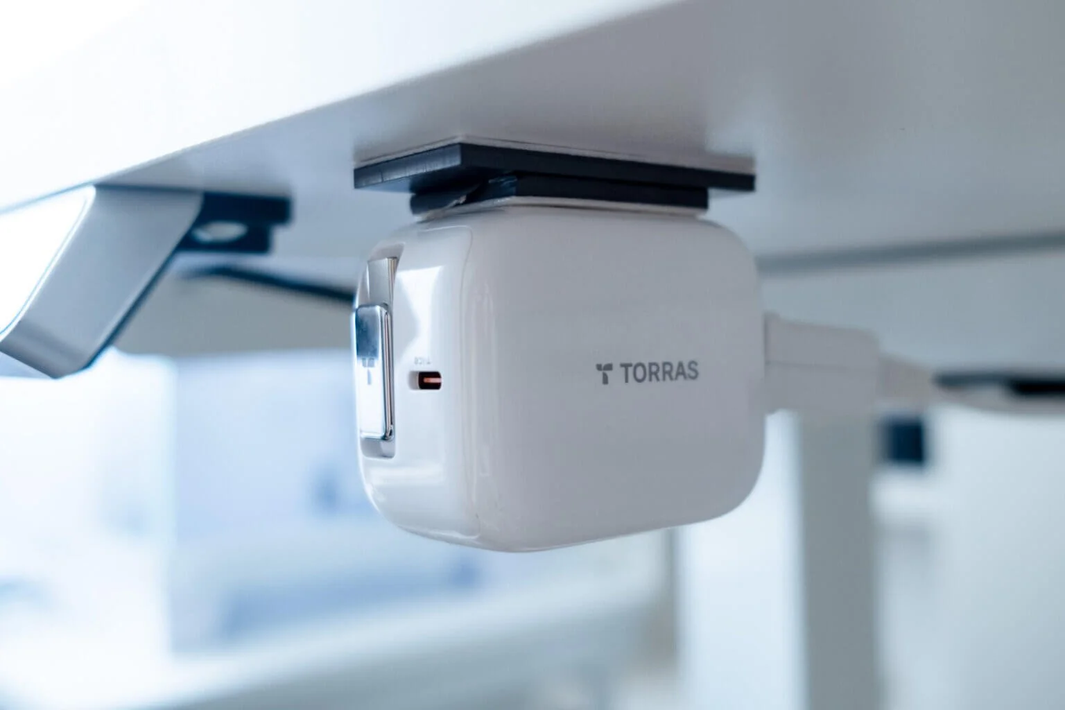 また、僕はTORRAS FlexLine 自動巻き取り式充電器をデスクを下に配置することで、より配線をすっきりさせるようにしています。
