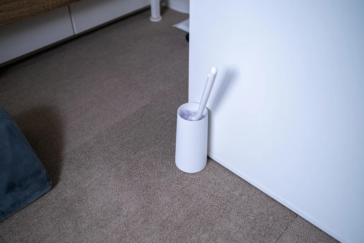 山崎実業のハンディーワイパー スタンドにクイックルワイパーを入れて、あとはデスクの足元などに置いておけば、見た目はシンプルで使いたい時にさっと取り出すことが可能になります。
