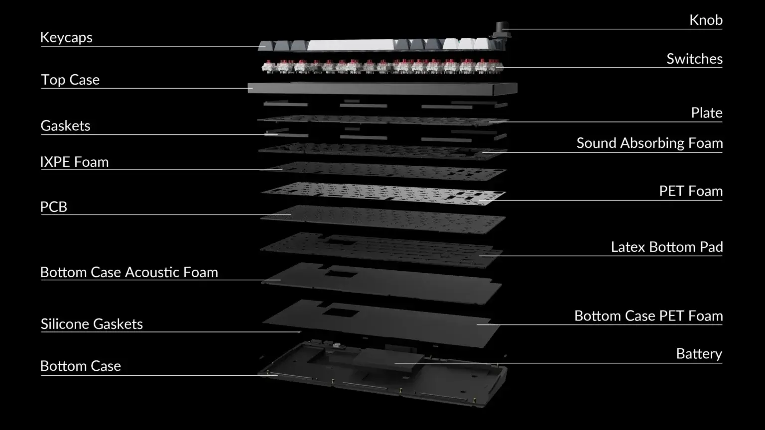 一方でKeychron Q1 Maxは、前述したダブルガスケットに加えてケースの底には厚手の吸音フォームが敷かれ、キースイッチが取り付けられるプレートと基板(PCB)の間にはIXPEシートが、基板の下にはPETフィルムが配置されています。