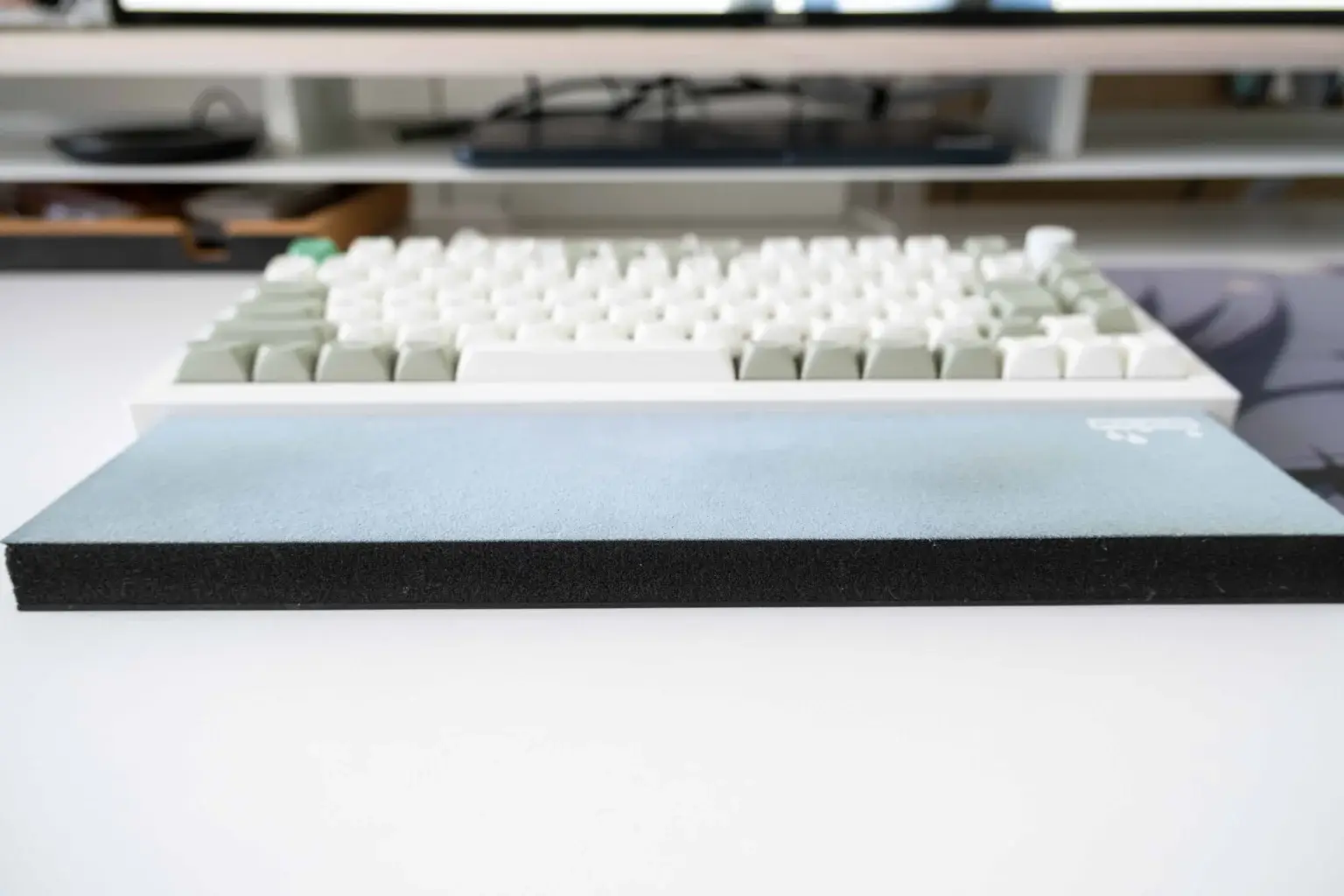 Keychron Q1 Maxは机から約2.3㎝ほど高さがあるので、リストレストがないと手首を痛めてしまうほどです。